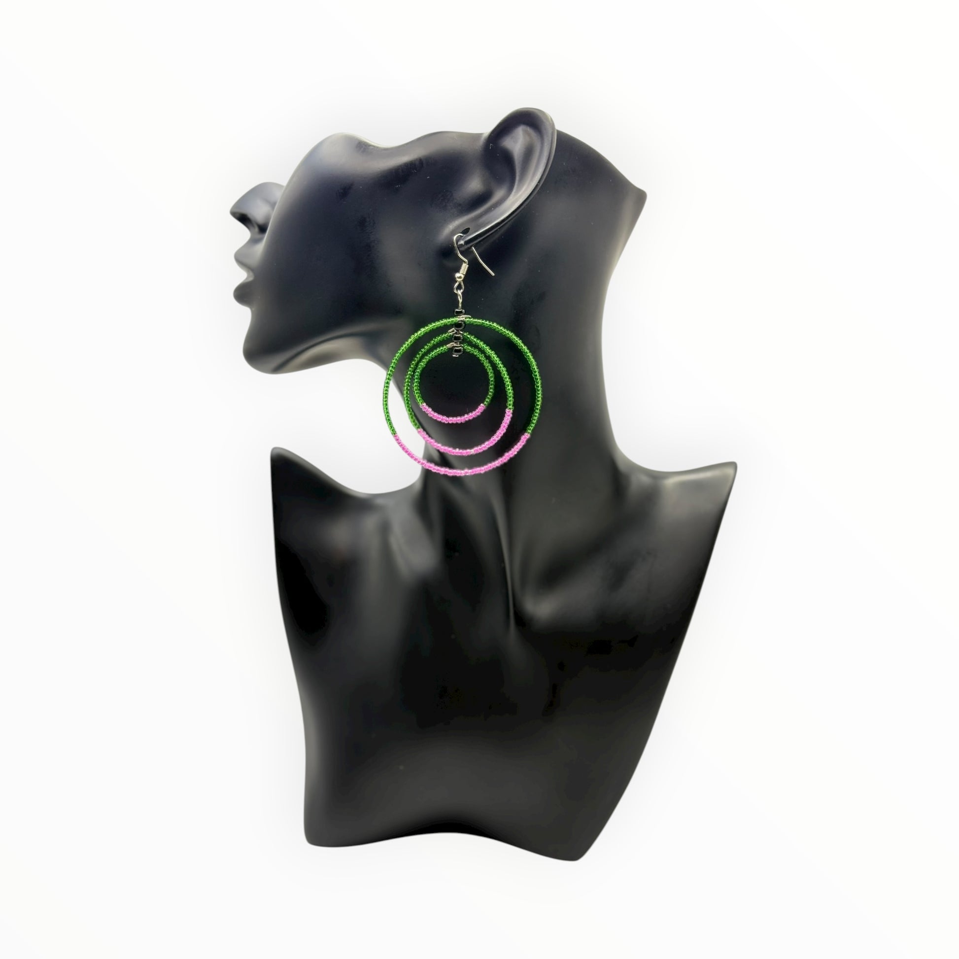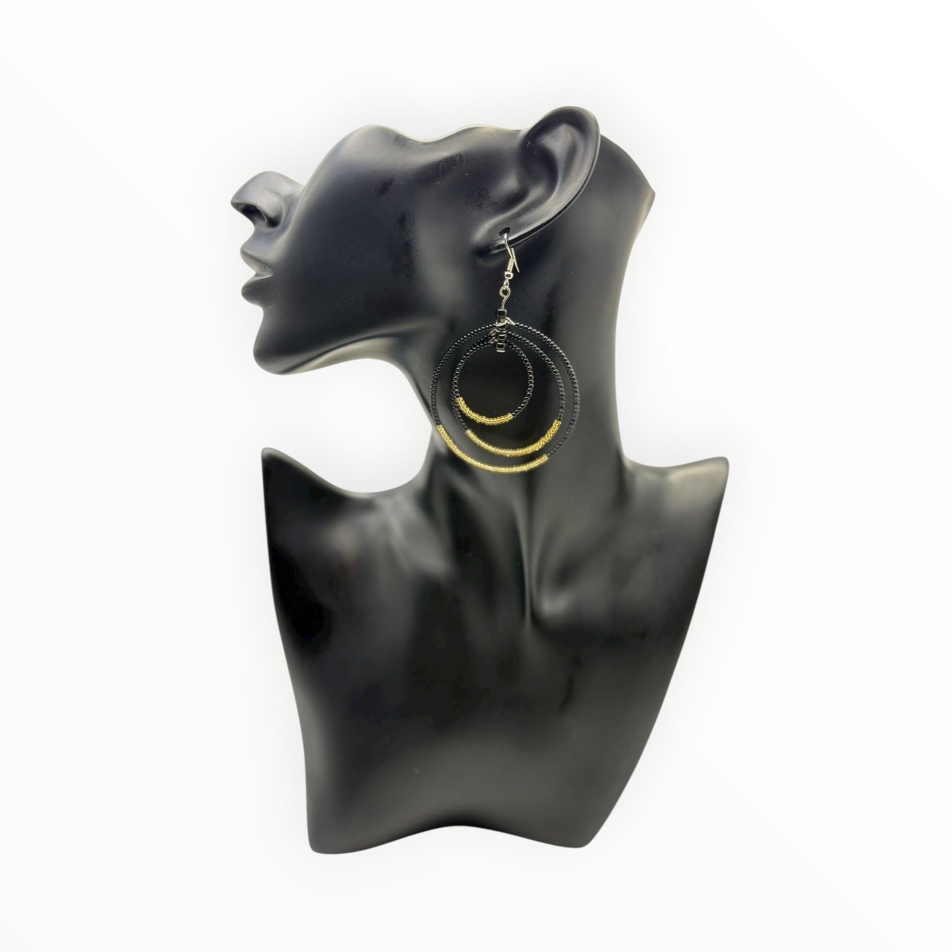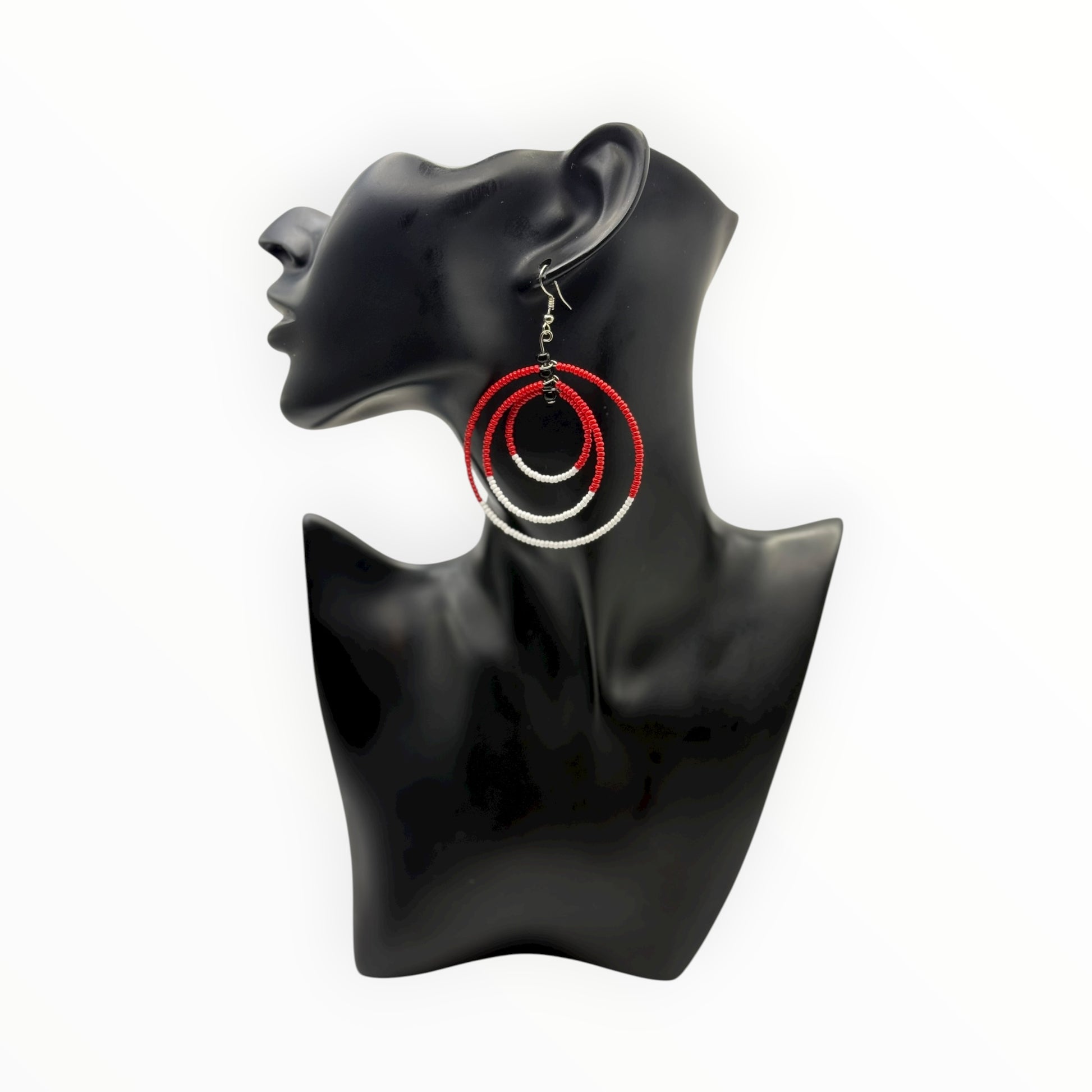 Make a bold statement with these striking triple hoop earrings, handcrafted by Maasai women in Kenya. Each earring features layers of beads accented with large black beads. Each pain is a vibrant expression of artistry, culture and resilience. With every purchase, you support Maasai women helping to sustain their craft, preserve cultural traditions and uplift communities. Each earring is one of a kind with slight variations that make your pair uniquely yours.
