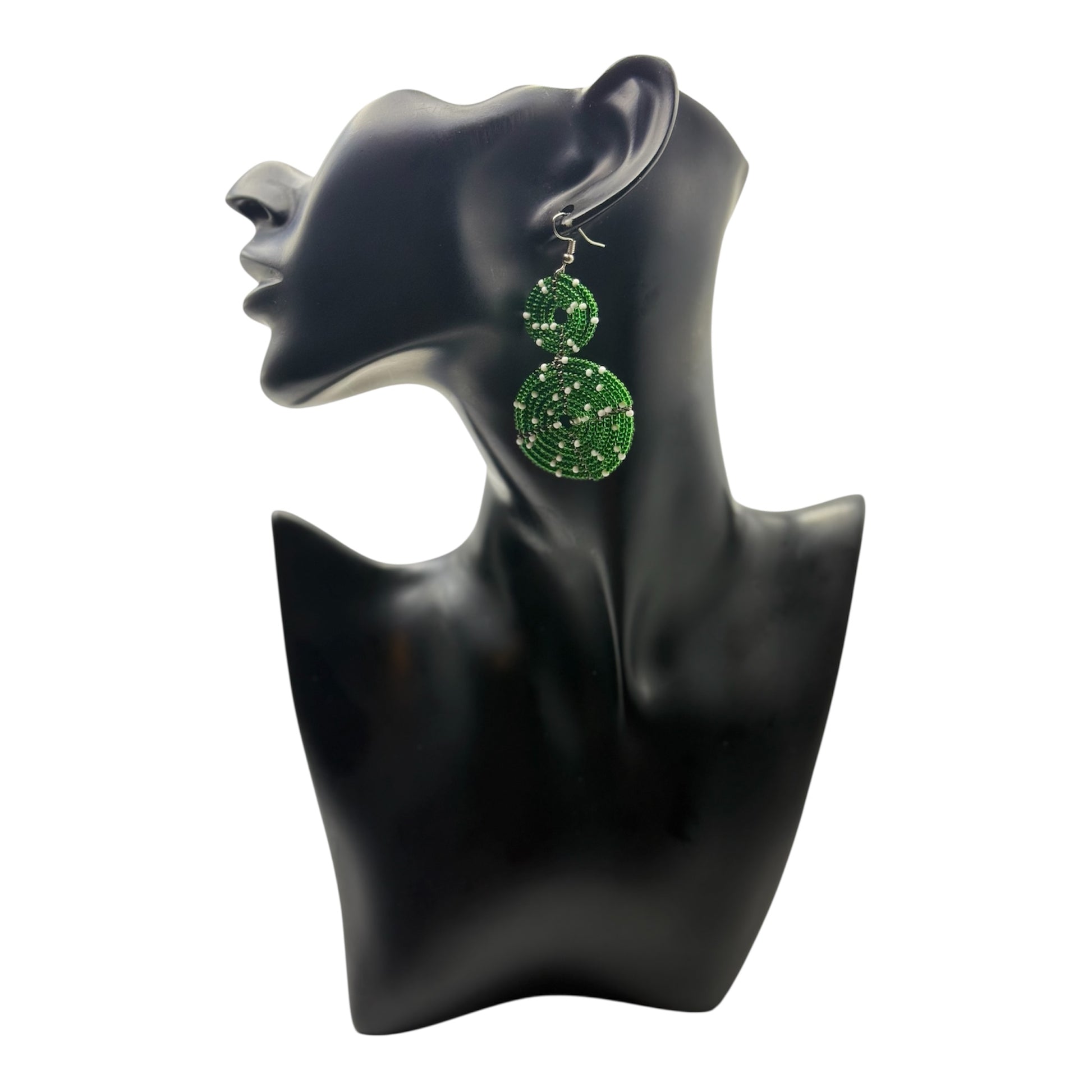 Details: • Hand-beaded with high-quality glass beads • Length: 3 inches • Circle 1 width: 0.5 inch • Circle 2 width: 1.0 inch • Hypoallergenic hooks • Available in 8 vibrant color combinations