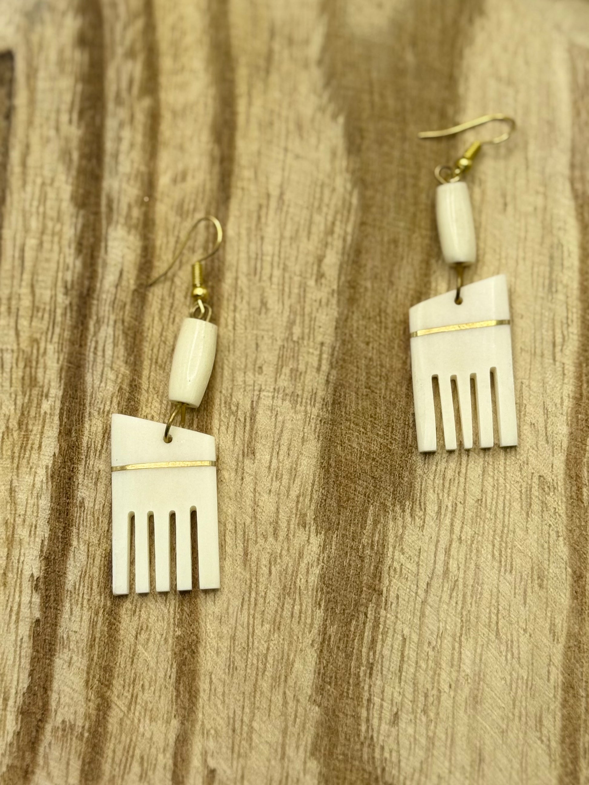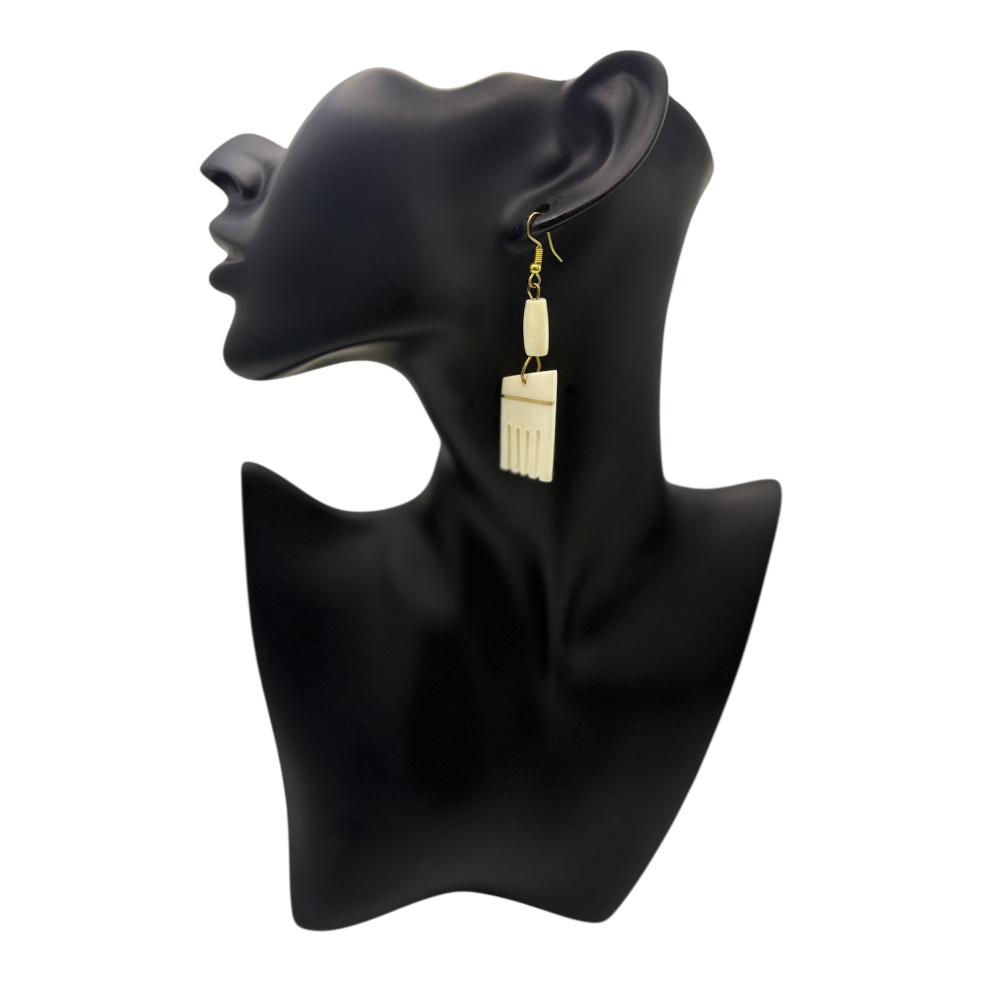 Celebrate heritage and artistry with the Duefe Heritage Comb Earrings, handmade in Kenya. The design is inspired by the duafe (also spelled duefe), a traditional comb that symbolizes femininity, care, and cultural pride. Each earring is carved from natural bone, accented with a sleek brass inlay, and finished with a graceful elongated bead for balance.