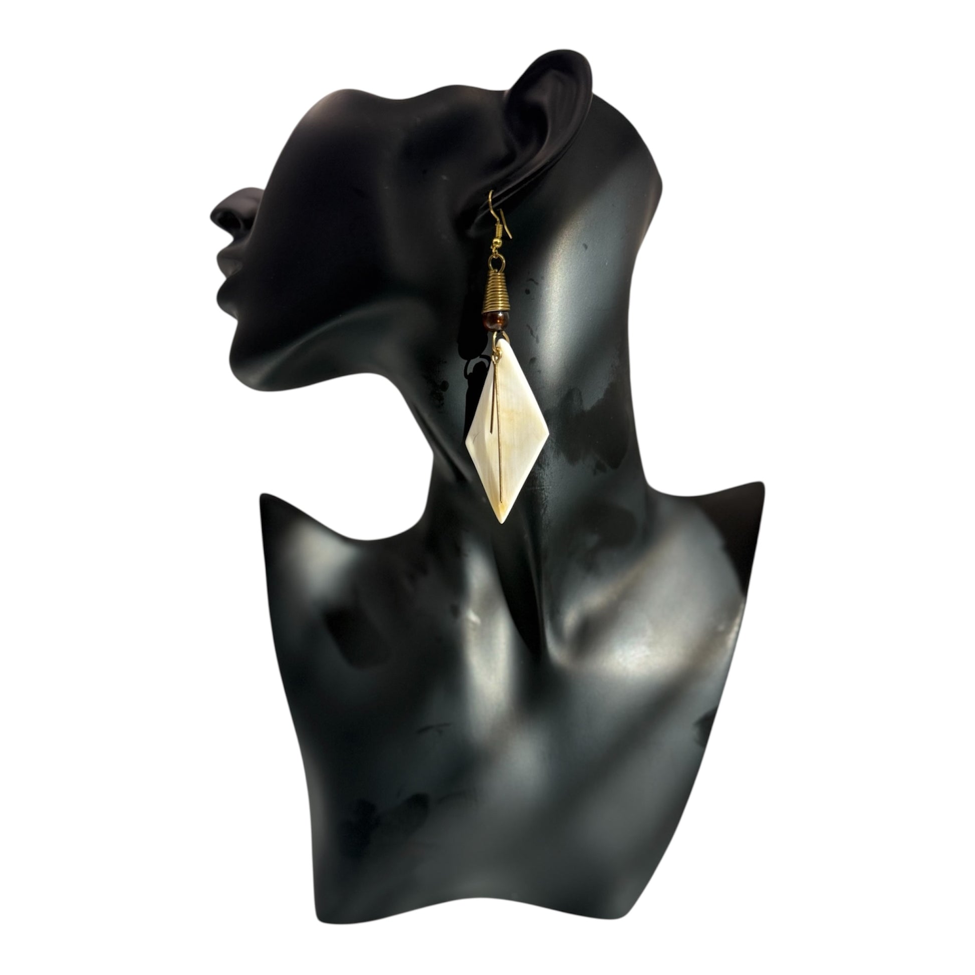 Bold geometry meets organic elegance in our Golden Drift Diamond Horn Drop Earrings. Featuring hand-polished horn cut into a soft diamond silhouette, these earrings are accented with warm brass wire detailing and a rich hand-painted bead that adds depth and contrast. The elongated brass line creates graceful movement, giving these earrings a modern yet timeless feel.