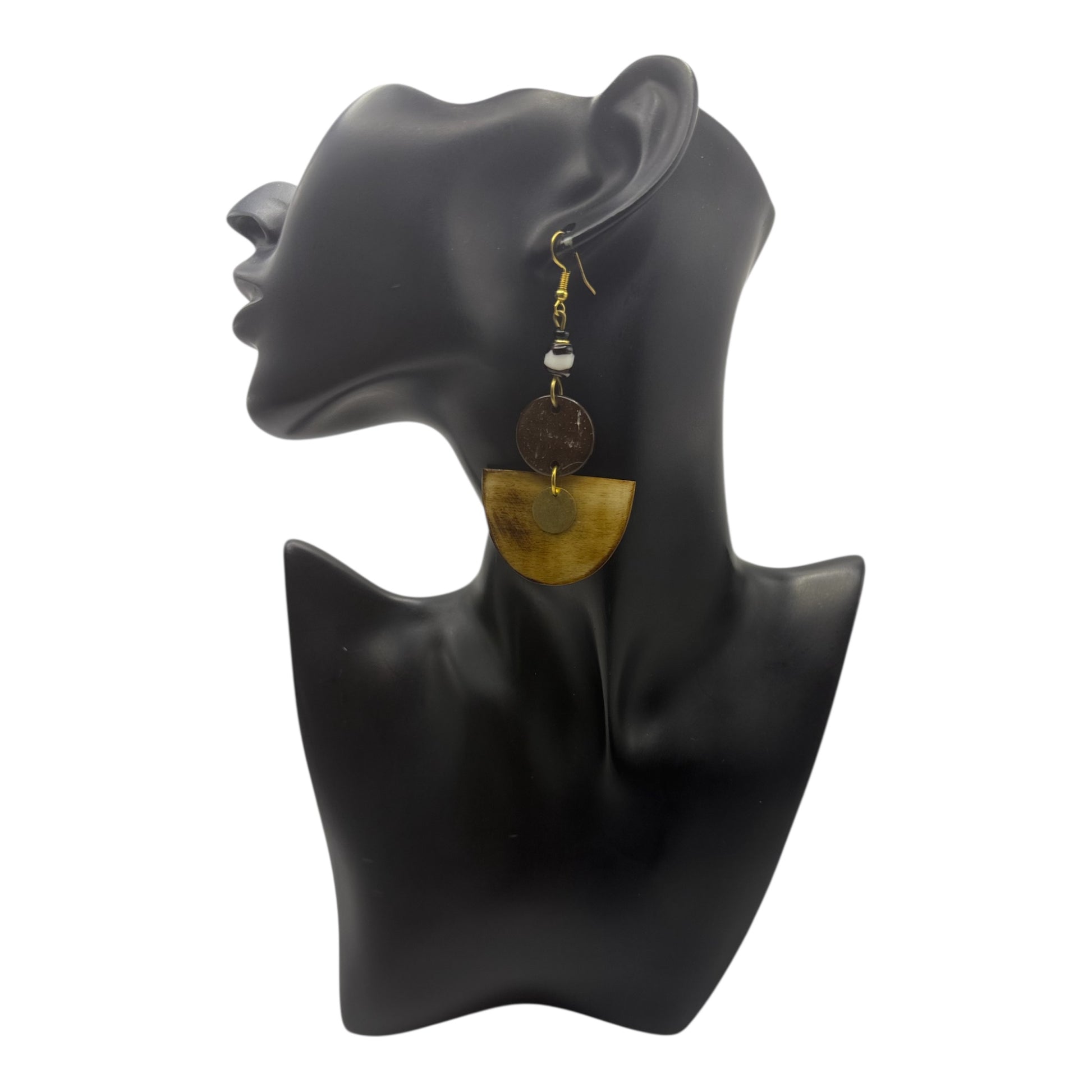 Earthy, elegant, and artistically balanced — the Sable Harmony Drop Earrings blend ethically sourced materials with modern design to create a stunning, lightweight statement piece. Crafted from polished cow horn and brass, each element showcases natural variations that make every pair beautifully one-of-a-kind. The layered silhouette and warm golden half-moon accent create effortless movement and Afro-chic sophistication.