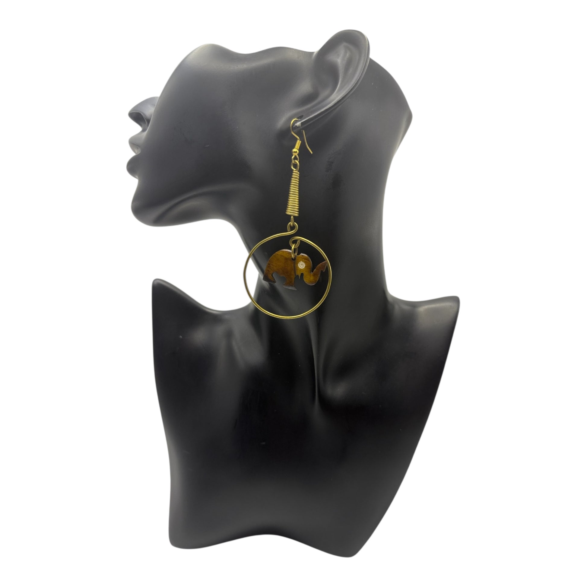 Celebrate strength, heritage, and artistry with these beautifully handcrafted earrings featuring an elephant charm carved from ethically sourced cow bone. Suspended inside a sleek gold-tone hoop and accented with a coiled wire detail, this design brings a playful yet elegant touch to any outfit.