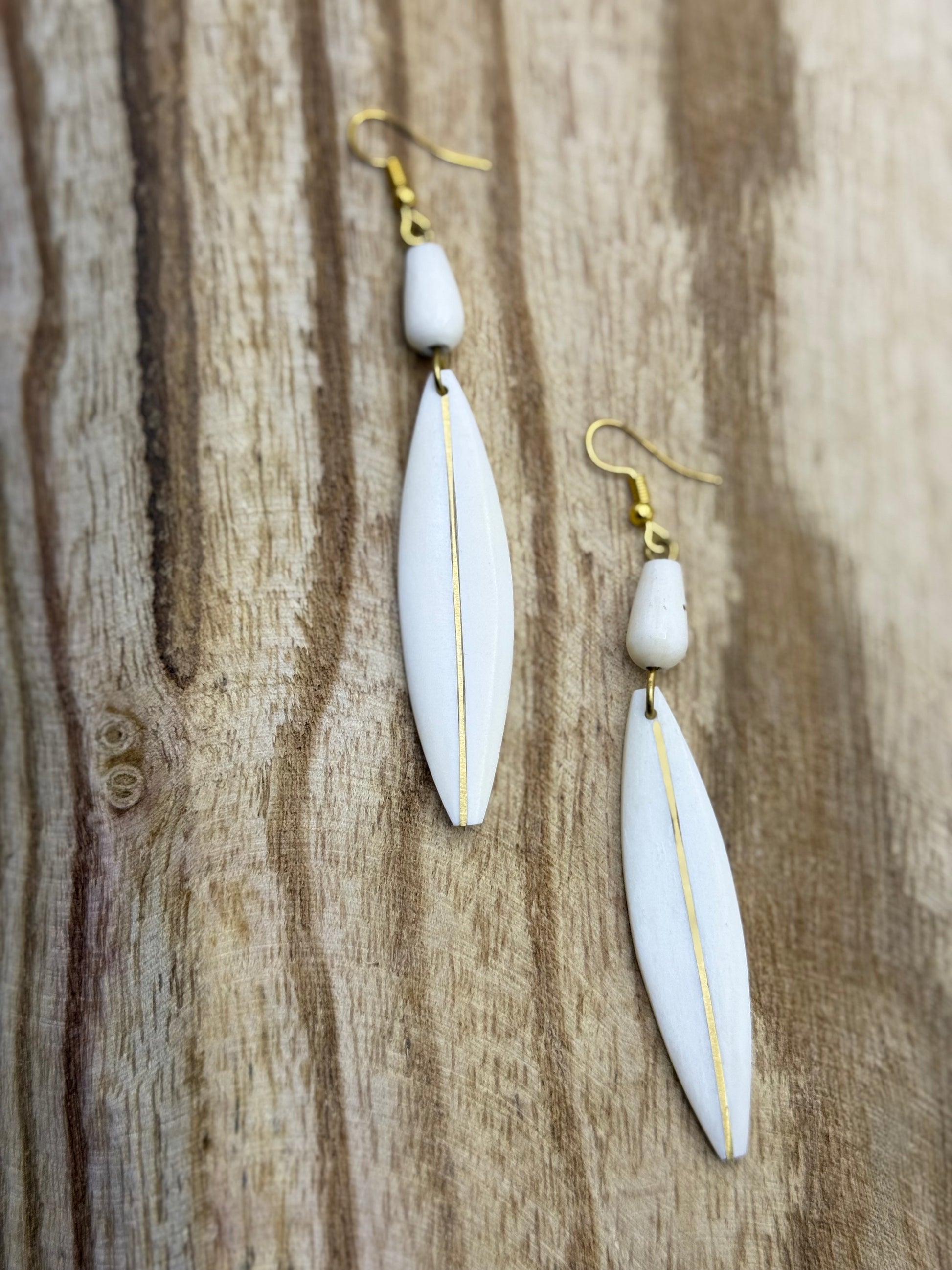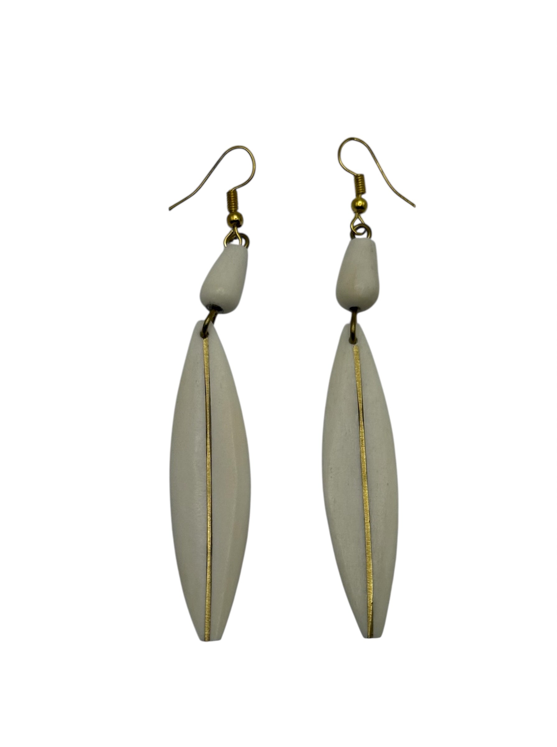 Sleek and powerful, the Spearline Elegance Earrings draw inspiration from traditional African spear shapes, symbolizing protection, strength, and resilience. Handmade in Kenya, each elongated bone pendant is accented with a slim brass inlay that runs gracefully through the center, creating a modern minimalist statement.