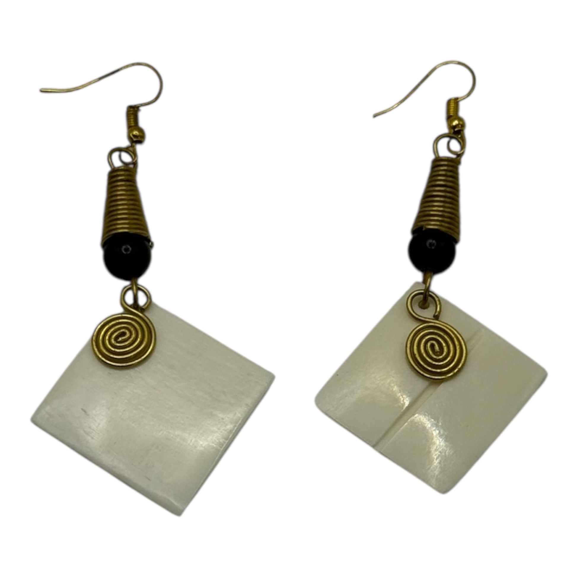 Handmade in Kenya, the Spiral Balance Earrings blend bold geometry with symbolic design. Featuring hand-carved bone squares accented with a brass spiral — representing growth and continuity — and grounded with a black bead detail, these earrings bring harmony to modern style and traditional craftsmanship. Each pair is uniquely handmade, with natural variations that make every set one-of-a-kind. Approx. 3.5 inches long.