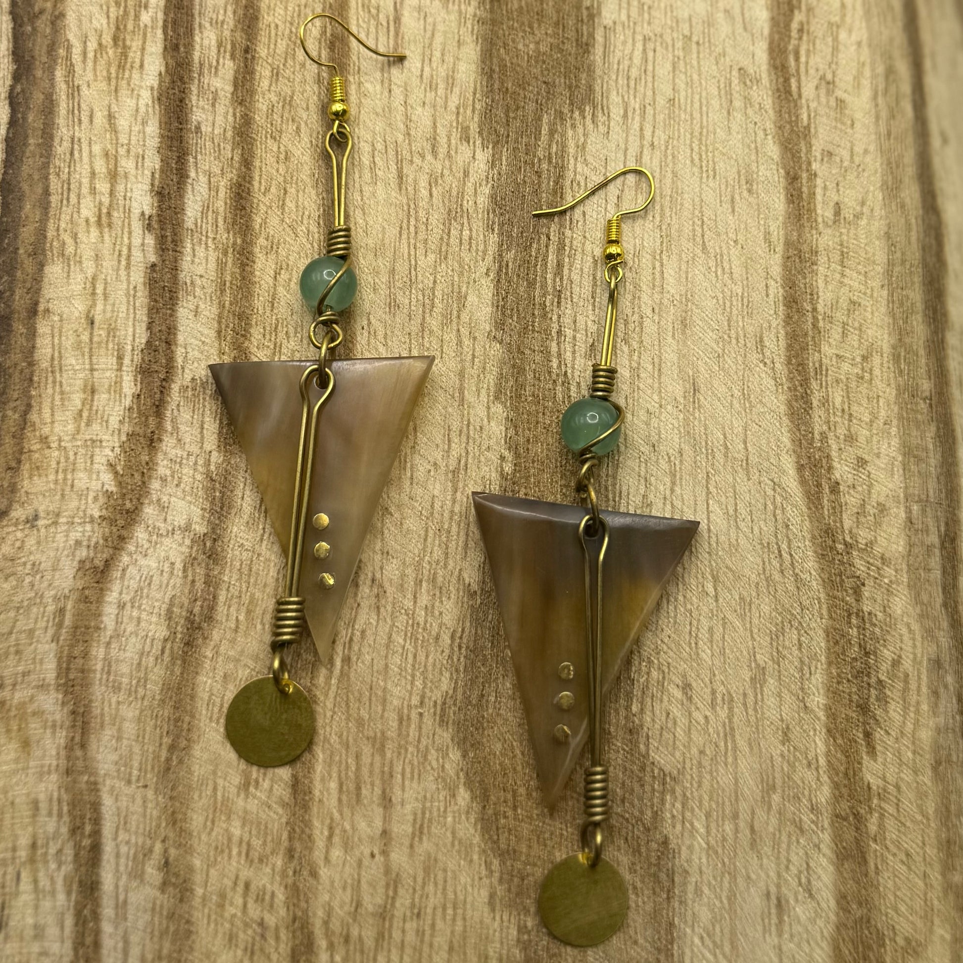 Bold geometry meets organic elegance in our Tri-Spire Horn Statement Earrings. Featuring hand-polished horn in a sculptural triangular silhouette, these earrings are accented with a soft green stone, brass wire wrapping, and a hammered brass disc for added movement and shine. The layered design creates a striking balance of structure and fluidity, making these earrings a true statement piece.